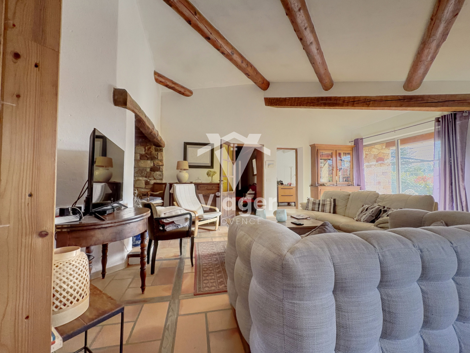 - Grande pièce de vie lumineuse avec larges baies vitrées ouvertes sur le jardin,